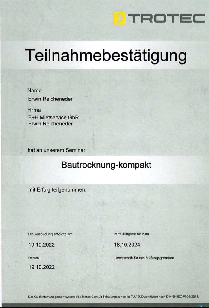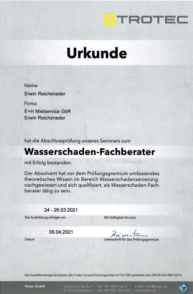 E+H Mietservice ist ihr professioneller Partner im Bereich Bautrocknung und Wasserschäden. Wir zeichnen uns durch absolute Flexibilität und Zuverlässigkeit aus. Selbst an Sonn- und Feiertagen sind wir für Sie erreichbar.